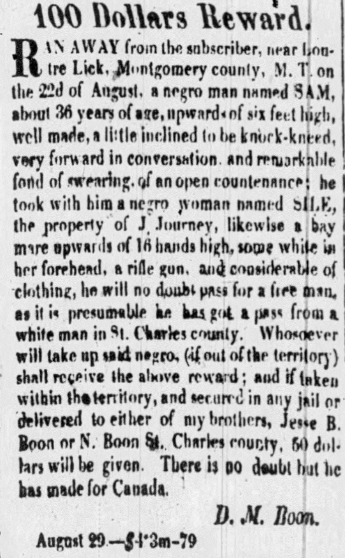 On the 22nd of August in 1819, an enslaved man named Sam, who was about 36 years old, ran away from his enslaver, Daniel Morgan Boone, son of the famous trailblazer Daniel Boone. Daniel Morgan quickly advertised that a reward of $100 would be given if Sam was secured in any jail, out of the territory; or $50 if captured and returned to either of his brothers, Nathan or Jesse Boone.