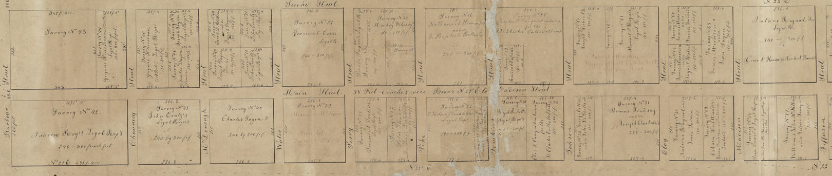 For clues to its’ history one has to look at what information is shared and the purpose. This map provides a) the layout of streets, their names, and measurements; b) names inside some of the blocks formed by that grid; c) the dimensions of the blocks in the old French Foot measurement; and a survey number of that block of land. The names of the streets running north and south and parallel to the Missouri River are Main, Second, High and Fourth. The cross streets (these run east-west) run from Barbour, which is the original southern city limits to Tecumseh Street on the north. The Missouri River is not shown, neither is the Boone’s Lick Road, nor any buildings, landmarks or terrain. This map was probably made by Benjamin Emmons (the first) to start and establish who was where in St. Charles.