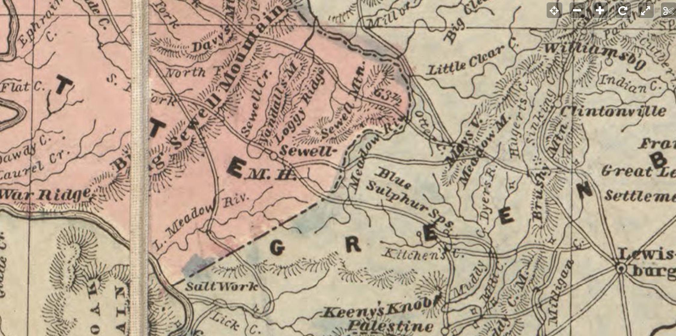 We entered on a very mountainous region crossed Meadow Mountain, Big and Little Sewell and numerous other ridges, for which the inhabitants say thay cannot afford names. All along these, numerous houses have been built for the purpose fo keeping entertainment. Many of them good houses. Houses are still being built for that purpose and much more land is clearing out where formerly there were no settlements. Staid all night at Tyrees fared well.